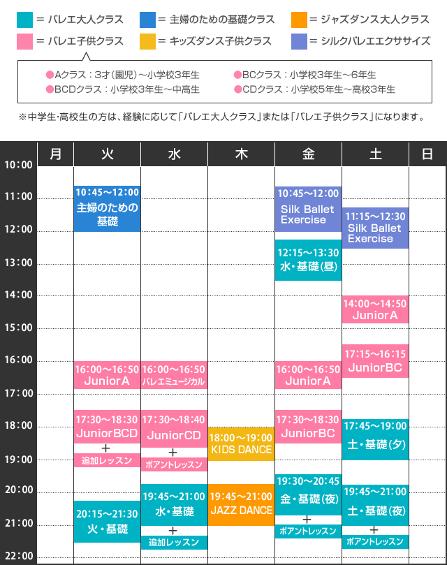 たとえば大人バレエの基礎クラスなら、火曜、水曜、金曜、土曜の4つのクラスがありますから、ご都合に合わせてお選びいただけます。